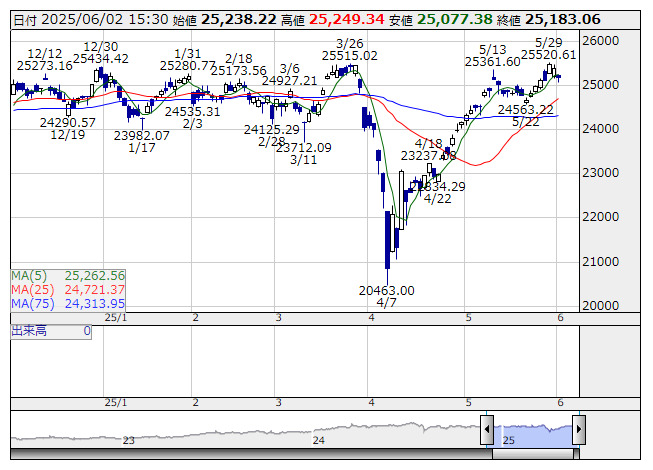 2025年06月02日15時47分 【市況】JPX日経400先物:2日清算値=170ポイント安、2万5170ポイント JPX日経400 <日足> 「株探」多機能チャートより 2日15時45分、JPX日経インデックス400先物期近2025年6月限は前週末清算値比170ポイント安の2万5170ポイントで取引を終えた。出来高は2062枚だった。この日のJPX日経インデックス400の現物終値2万5183.06ポイントに対しては13.06ポイント安。 株探ニュース