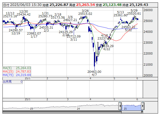 2025年06月03日15時47分 【市況】JPX日経400先物:3日清算値=45ポイント安、2万5125ポイント JPX日経400 <日足> 「株探」多機能チャートより 3日15時45分、JPX日経インデックス400先物期近2025年6月限は前日清算値比45ポイント安の2万5125ポイントで取引を終えた。出来高は1718枚だった。この日のJPX日経インデックス400の現物終値2万5129.43ポイントに対しては4.43ポイント安。 株探ニュース
