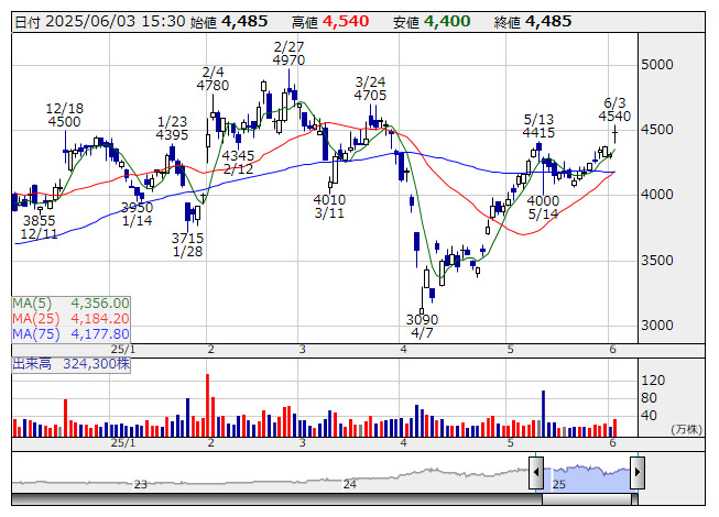 明電舎 <日足> 「株探」多機能チャートより<6508> 明電舎 4485 +170