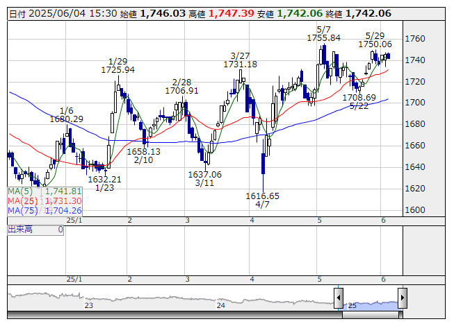2025年06月04日15時48分 【市況】東証REIT指数先物:4日清算値=8.5ポイント安、1745ポイント REIT指数 <日足> 「株探」多機能チャートより 4日15時45分、東証REIT指数先物期近2025年6月限は前日清算値比8.5ポイント安の1745ポイントで取引を終えた。出来高は592枚だった。この日の東証REIT指数の現物終値1742.06ポイントに対しては2.94ポイント高。 株探ニュース