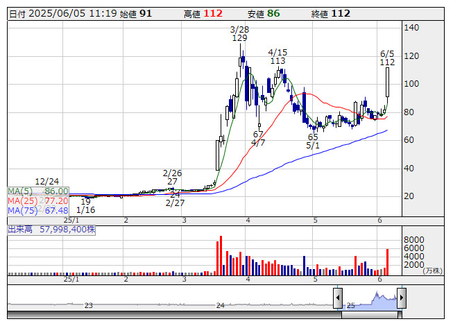 【材料】前場のランキング【寄付からの値上がり率】 (6月5日)