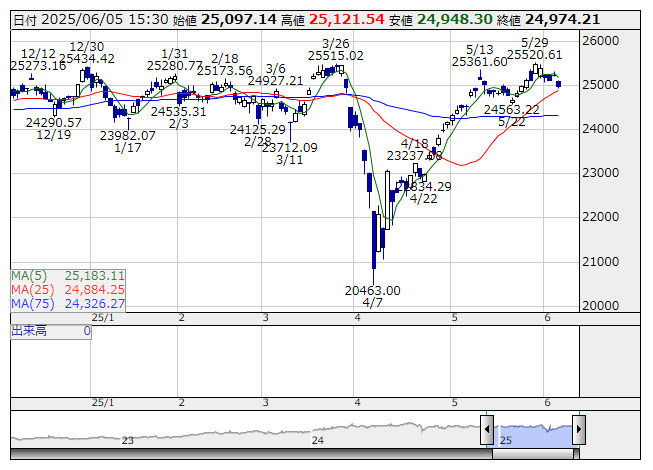 2025年06月05日15時47分 【市況】JPX日経400先物:5日清算値=300ポイント安、2万4935ポイント JPX日経400 <日足> 「株探」多機能チャートより 5日15時45分、JPX日経インデックス400先物期近2025年6月限は前日清算値比300ポイント安の2万4935ポイントで取引を終えた。出来高は2358枚だった。この日のJPX日経インデックス400の現物終値2万4974.21ポイントに対しては39.21ポイント安。 株探ニュース