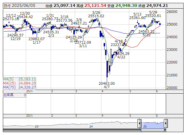 2025年06月06日08時46分 【市況】JPX日経400先物:6日寄り付き=20ポイント高、2万4955ポイント JPX日経400 <日足> 「株探」多機能チャートより 6日8時45分、JPX日経インデックス400先物期近2025年6月限は前日清算値比20ポイント高の2万4955ポイントで寄り付いた。前日のJPX日経インデックス400の現物終値2万4974.21ポイントに対しては19.21ポイント安。 株探ニュース
