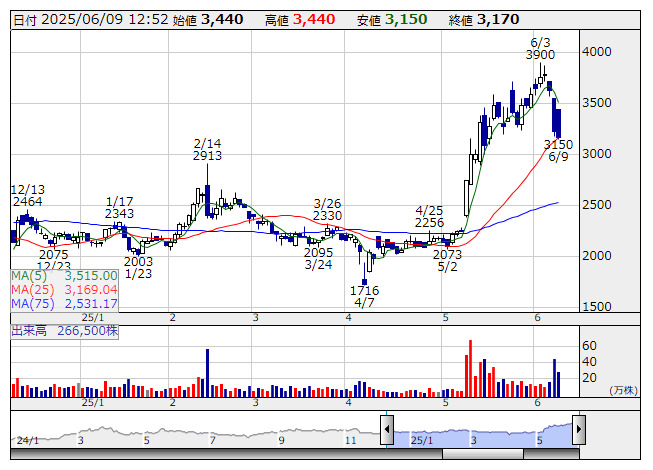 もみ合い。5月月次KPIを発表、売上高は前年同月比3倍となった。実店舗での販売が好調に推移したことから、予算に基づき順調に進捗し、ブランド別では、「9090」が引き続き牽引したほか、「Her lip to」、「MARITHE」が売上を伸ばした。MARITHE + FRANCOIS GIRBAUD原宿店が5月度は店舗として過去最高の単月売上高を達成するなど、好調に推移している。あわせて、伊藤忠商事と「SATUR」ブランド事業に関する販売特約店契約を締結することも発表している。