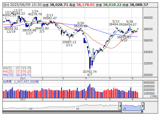 日経平均 <日足> 「株探」多機能チャートより日経平均ボラティリティー・インデックス(投資家が将来の市場変動の大きさをどう想定しているかを表した指数)は9日、前日比-0.78(低下率3.31%)の22.78と低下した。なお、高値は23.24、安値は22.57。先週末の米株式市場で主要指数が上昇した流れを受け、今日の東京市場は買いが先行し、日経225先物は上昇、日経VIは低下して始まった。市場では日米や米中の通商協議への期待感がある一方、警戒感も意識されているが、今日は取引開始後も日経225先物が堅調な推移となったことから、ボラティリティーの高まりを警戒するムードが緩和。日経VIは終日、先週末の水準を下回って推移した。