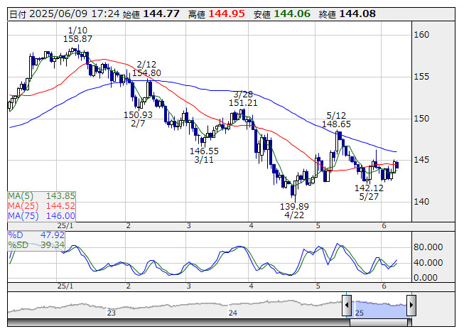 米ドル/円 <日足> Slowストキャス 「株探」多機能チャートより9日の欧米外為市場では、ドル・円は下げ渋る展開を予想する。欧米諸国の主要経済指標の発表は特に予定されていないため、ロンドンで行われる米中両国の主要貿易交渉担当者による協議の行方が注目されそうだ。報道によると、トランプ米大統領は6日、「中国の習近平国家主席が鉱物やそれを使用する磁石の材料の供給再開に同意した」と発言。一方、中国政府は7日、「一部のレアアース輸出申請を一部承認した」と発表した。ただ、対象となる国や産業については明らかにしなかった。なお、ホワイトハウスのハセット国家経済会議(NEC)委員長は8日、米CBSNのニュース番組で「携帯電話などに不可欠なレアアースや磁石が、4月初旬以前と同じように流通することを望んでいる」と伝えている。 中国製品に対する関税の猶予措置は8月に期限を迎えるため、それまでに米中協議は何度か行われる可能性がある。今回の協議で具体的な進展がみられた場合、リスク回避的な為替取引は縮小し、主要通貨に対する円売りがやや強まりそうだ。