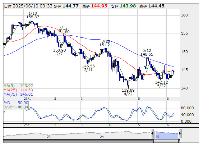 米ドル/円 <日足> Slowストキャス 「株探」多機能チャートよりNY連銀が発表した5月消費者調査でインフレ期待の1年物は3.2%と、4月3.63%から予想以上に低下した。3年先は3.0%と、4月3.17%から低下、5年先も2.61%と4月2.74%から低下した。