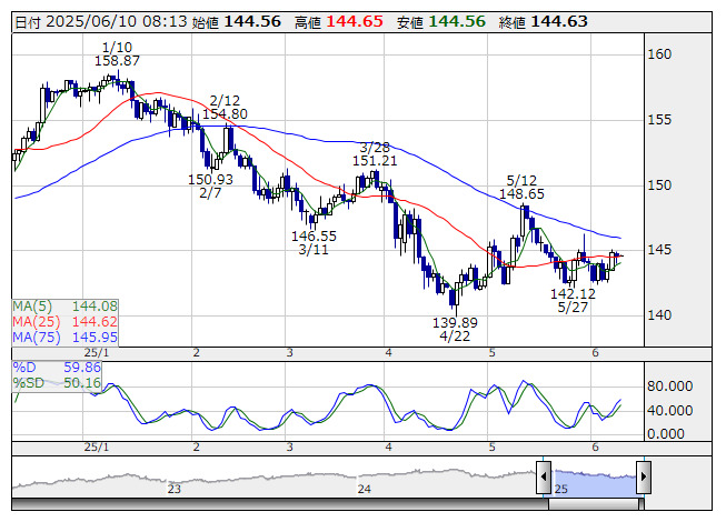 米ドル/円 <日足> Slowストキャス 「株探」多機能チャートより9日のドル・円は、東京市場では144円95銭から144円11銭まで下落。欧米市場では143円98銭まで売られた後、144円77銭まで反発し、144円61銭で取引終了。本日10日のドル・円は主に144円台で推移か。米中協議の進展が引き続き期待されており、ドルは下げ渋る可能性がある。