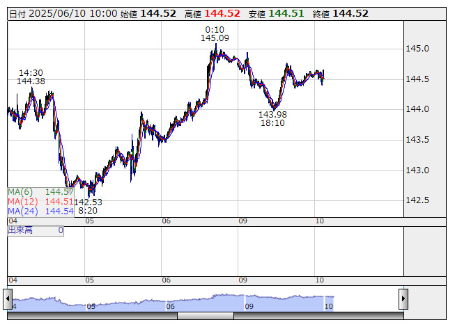 2025年06月10日10時01分 【通貨】外為:1ドル144円51銭前後とドル高・円安で推移 米ドル/円 <5分足> 「株探」多機能チャートより 10日の外国為替市場のドル円相場は午前10時時点で1ドル=144円51銭前後と、前日午後5時時点に比べ38銭のドル高・円安。ユーロ円は1ユーロ=165円10銭前後と46銭のユーロ高・円安で推移している。 株探ニュース