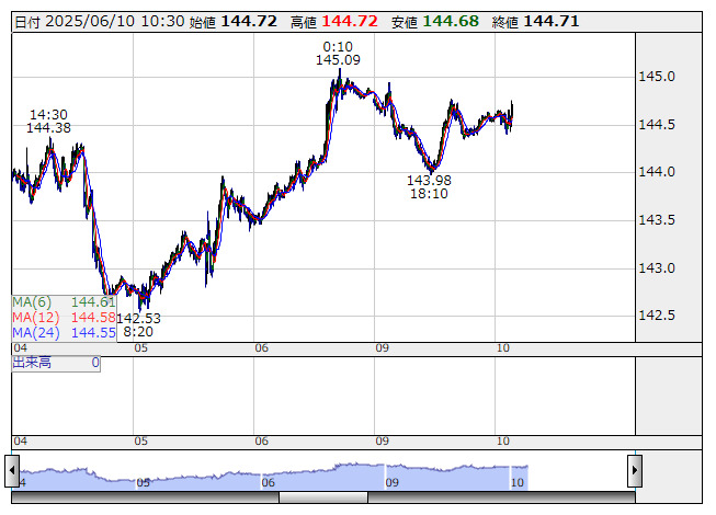 米ドル/円 <5分足> 「株探」多機能チャートよりドル円は、午前8時時点では144円60銭前後で取引されていたが、午前9時30分頃には144円40銭台に軟化し、その後144円50銭近辺に値を戻している。米中閣僚級協議の進展に対する関心が高く、市場には様子見姿勢が強まっている。今週は11日に米5月消費者物価指数(CPI)の発表も予定されている。きょうはゴトー日(5のつく日と10のつく日)だが、限られた値動きとなっている。