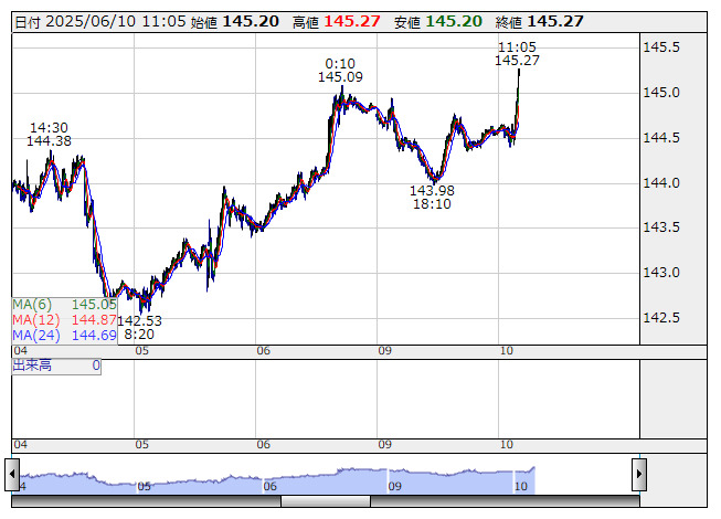 2025年06月10日11時05分 【通貨】東京為替:ドル・円は145円台に反発 米ドル/円 <5分足> 「株探」多機能チャートより 10日午前の東京市場で米ドル・円は反発。144円40銭まで下げた後、145円06銭まで戻した。日本銀行植田総裁は基調物価についての見解を述べたことに反応したようだ。ユーロ・ドルは下げ渋り、1.1436ドルまで買われた後、1.1395ドルまで反落。ユーロ・円は下げ渋り、165円05銭から165円32銭まで値上り。 《MK》 提供:フィスコ