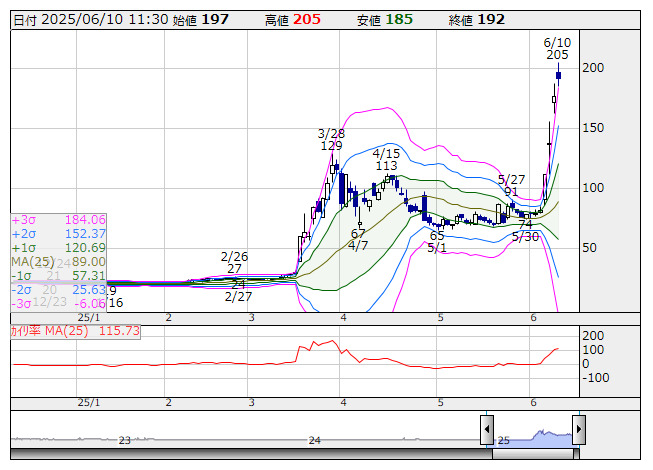 Sサイエンス <日足> ボリンジャー/カイリ率 「株探」多機能チャートより●株価が+3σを上回った銘柄(市場人気順) ★株価の上げ足が速過ぎ、売りが出やすい銘柄