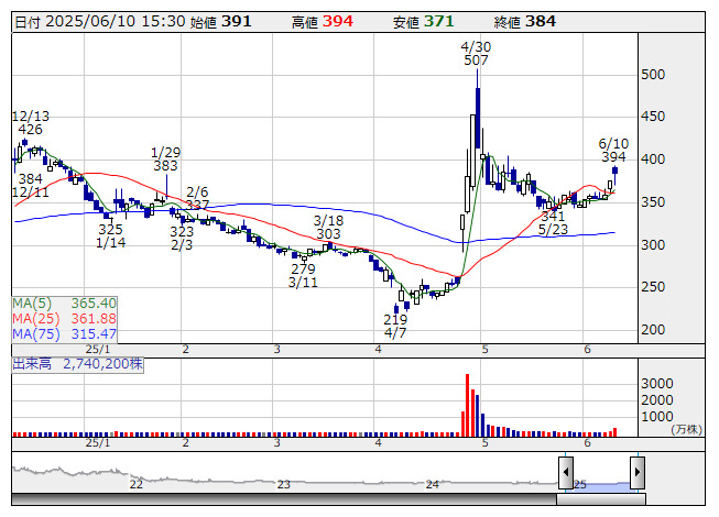 大幅反落。東京証券取引所が10日から同社株の信用取引による新規の売付け・買付けに係る委託保証金率を50%以上(うち現金20%以上)にすると発表したことを受けて、これを嫌気した売りに押されている。また、また、日本証券金融も増担保金徴収措置の実施を発表し、同日以降、貸借取引自己取引分および非清算参加者ごとの清算取次貸借取引自己取引分の貸借担保金率を50%(うち現金担保分20%)にするとしている。