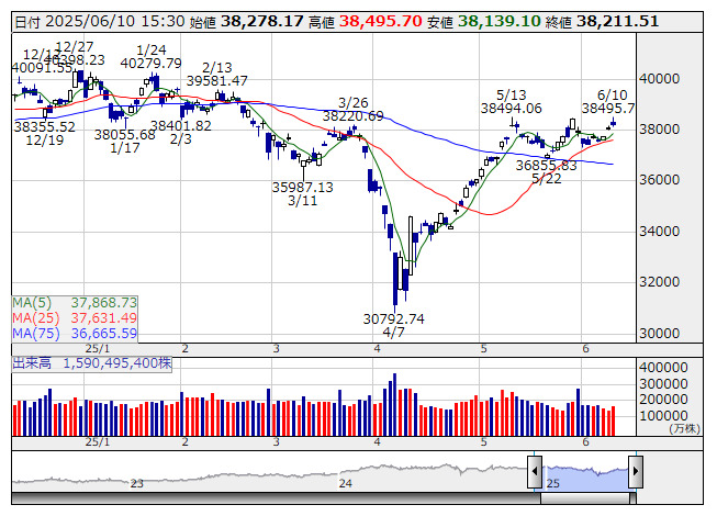 日経平均 <日足> 「株探」多機能チャートより日本取引所が公表した先物手口情報によると、6月10日の日経225ミニ期近(2025年6月限)の日中取引(立会内・J-NETの合算)で、取引高トップはABNクリアリン証券の27万4406枚だった。