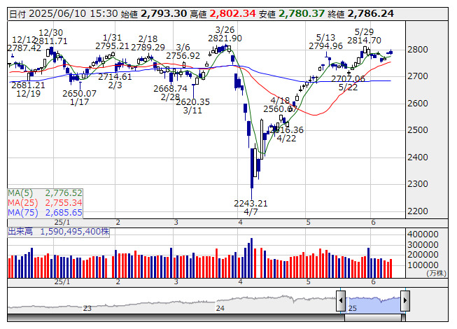 TOPIX <日足> 「株探」多機能チャートより日本取引所が公表した先物手口情報によると、6月10日のTOPIX先物期近(2025年6月限)の日中取引(立会内・J-NETの合算)で、取引高トップはみずほ証券の9万8611枚だった。