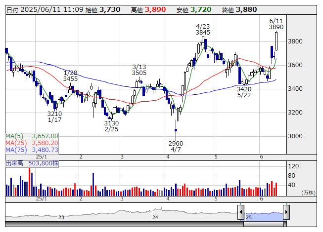 2025年06月11日11時10分 【材料】物語コーポ---大幅続伸、5月既存店は11カ月ぶり2ケタ成長に 物語コーポ <日足> 「株探」多機能チャートより 物語コーポ<3097>は大幅続伸。前日に5月の月次動向を発表している。国内直営店+FC店の既存店売上高は前年同月比11.7%増となり、12カ月連続でのプラス成長、かつ、11カ月ぶりの2ケタ成長となっている。客数が同7.6%増と伸長する形に。焼肉部門が一転2ケタ増に回復しているほか、ラーメン、お好み焼、ゆず庵、専門店などの各部門は揃って売上成長が続く形になっている。 《ST》 提供:フィスコ