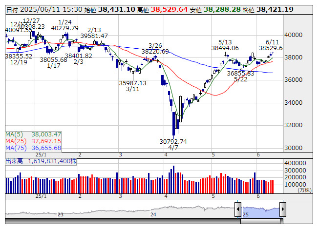 【市況】【↑】日経平均 大引け| 4日続伸、半導体関連株を中心に買い優勢 (6月11日)