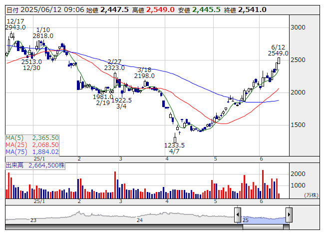 1. <6526> ソシオネクス 東証P 5,408 2543.5 ( +3.2 ) 日経225採用