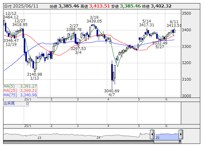 2025年06月12日10時53分 【市況】12日中国・上海総合指数=寄り付き3397.9720(-4.3439) 上海総合 <日足> 「株探」多機能チャートより 12日の中国・上海総合指数は前営業日比4.3439ポイント安の3397.9720で寄り付いた。 出所:MINKABU PRESS