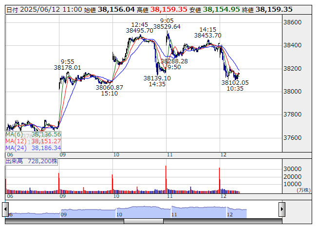 【市況】11時の日経平均は266円安の3万8154円、ファストリが80.63円押し下げ