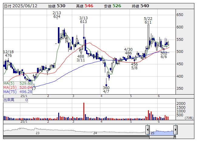 gumi <日足> 「株探」多機能チャートよりgumi<3903>はカイ気配スタート。11日取引終了後、25年4月期連結決算を発表。売上高は89億4200万円(前の期比25.9%減)、最終損益は20億6300万円の黒字(前の期59億3400万円の赤字)だった。黒字転換を好感した買いが膨らんでいる。主力の「モバイルオンラインゲーム事業」で、不採算タイトルの早期撤退や一部タイトルの他社への運営移管などを行った影響で減収に。一方、同事業の開発・運用体制の見直しに伴うコスト適正化が奏功し、損益面は改善した。「ブロックチェーン等事業」の好調も全体業績に貢献した。なお、続く26年4月期の業績予想は非開示、配当予想も未定(前期無配)とした。あわせて、SBIホールディングス<8473>と共同で上場暗号資産の運用ファンドを組成すると発表した。ファンド規模は数十億円程度になる予定。両社が持つブロックチェーンや金融のノウハウを活用することで先進性の高い金融サービスとして高いパフォーマンスを実現するとともに、新たな金融市場の創造を目指すという。