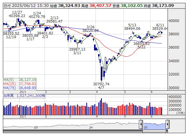 日経平均 <日足> 「株探」多機能チャートより12日の日経平均は5営業日ぶりに反落。248.10円安の38173.09円(出来高概算15億2000万株)で取引を終えた。前日の米国市場で主要株価指数が下落したことや円安が一服していることから、当面の利益を確保する売りが先行。前場終盤にかけて下げ幅を広げ、38102.05円まで水準を切り下げた。トランプ米大統領は「2週間以内に一方的に関税率を設定する」と米メディアが報じたことで、積極的な売買は手控えられ、売り一巡後は38100円~38200円辺りでのこう着が続いた。