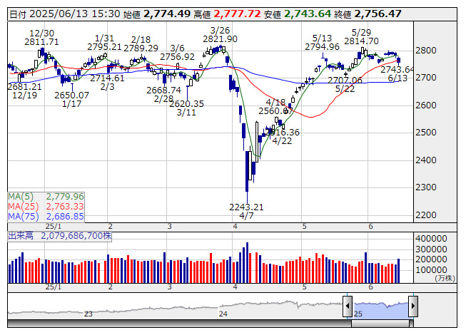 2025年06月13日15時47分 【市況】TOPIX先物:13日清算値=27ポイント安、2753ポイント TOPIX <日足> 「株探」多機能チャートより 13日15時45分、TOPIX先物期近2025年9月限は前日清算値比27ポイント安の2753ポイントで取引を終えた。出来高は4万8748枚だった。この日のTOPIXの現物終値2756.47ポイントに対しては3.47ポイント安。 株探ニュース