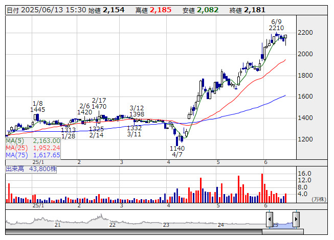 2025年06月13日18時50分 【市況】本日の【株式分割】銘柄 (13日大引け後 発表分) ジモティー <日足> 「株探」多機能チャートより ●ジモティー <7082> [東証G] 6月30日現在の株主を対象に1→2の株式分割を実施。最低投資金額は現在の2分の1に低下する。 [2025年6月13日] 株探ニュース