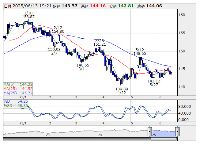 米ドル/円 <日足> Slowストキャス 「株探」多機能チャートより欧州市場でドル・円は144円を上抜け、一時144円16銭まで上値を伸ばした。米10年債利回りは底堅く推移し、ドル買いを後押し。ユーロや豪ドルなど主要通貨は対ドルで弱含む。一方、クロス円は欧州株安で円買いに振れやすいものの、ドル・円に追随した値動きに。