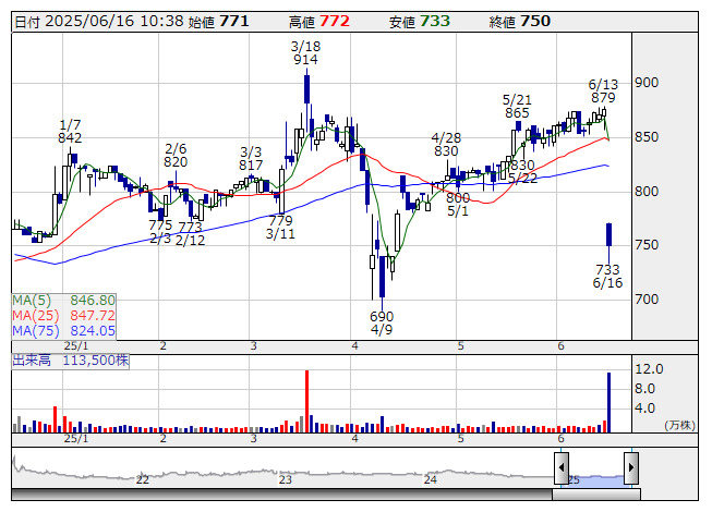 4174>が急反落した。同社は前週末13日の取引終了後、26年1月期第1四半期(2~4月)の連結決算を発表。売上高は前年同期比15.9%増の24億7500万円と2ケタの増収となった半面、最終損益は900万円の赤字(前年同期は7600万円の黒字)となった。赤字転落を嫌気した売りが優勢となっている。Webソリューションセグメントで不採算案件が発生したほか、推しカルチャー&ゲームセグメントにおいて新規の運営案件に対応することとなり、外注費用が一時的に増加した。M&Aの実施に伴う支払手数料の一時的な増加も響いた。
