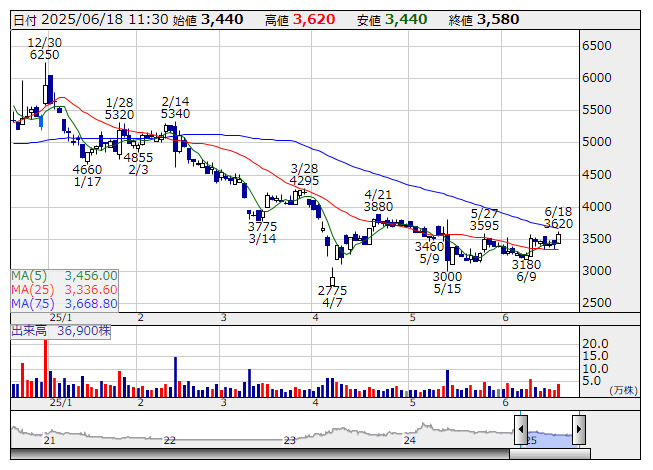 ヘッドウォ <日足> 「株探」多機能チャートより