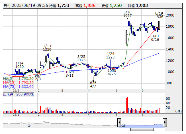 アヴィレン <日足> 「株探」多機能チャートより<5591> AVILEN 1898 +185