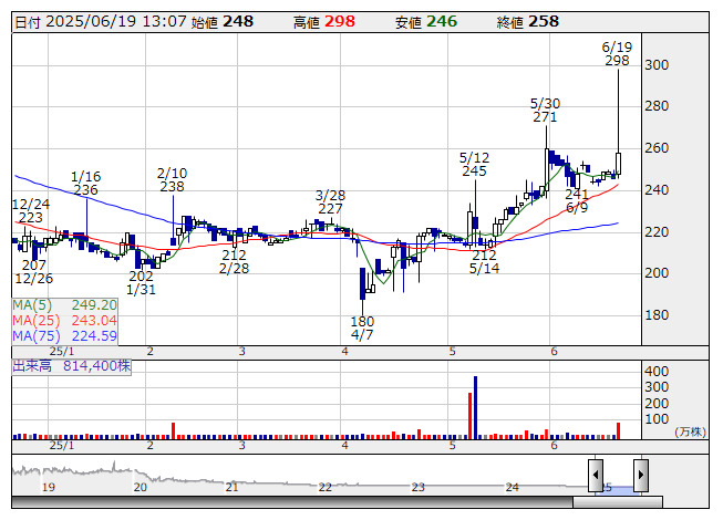 2025年06月19日13時08分 【材料】アンファクが後場一段高、広告収益の計算方法見直しで特別利益計上 アンファク <日足> 「株探」多機能チャートより and factory<7035>が後場一段高。同社はこの日、25年8月期第3四半期(3~5月)において、特別利益2800万円を計上すると発表。株価の押し上げ要因となった。取引先からの要請に基づき、広告収益の計算方法を見直すことに合意した。これを踏まえて特別利益を計上する。業績予想への影響については他の要因も含めて現在精査中で、判明次第開示するとした。 出所:MINKABU PRESS
