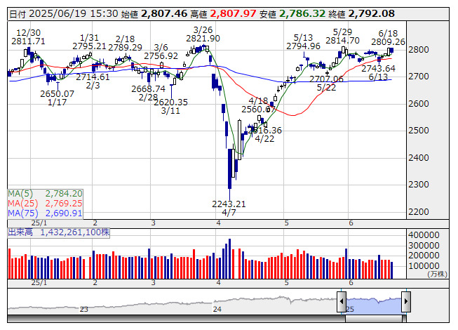 2025年06月19日15時47分 【市況】TOPIX先物:19日清算値=16ポイント安、2791ポイント TOPIX <日足> 「株探」多機能チャートより 19日15時45分、TOPIX先物期近2025年9月限は前日清算値比16ポイント安の2791ポイントで取引を終えた。出来高は3万2374枚だった。この日のTOPIXの現物終値2792.08ポイントに対しては1.08ポイント安。 株探ニュース