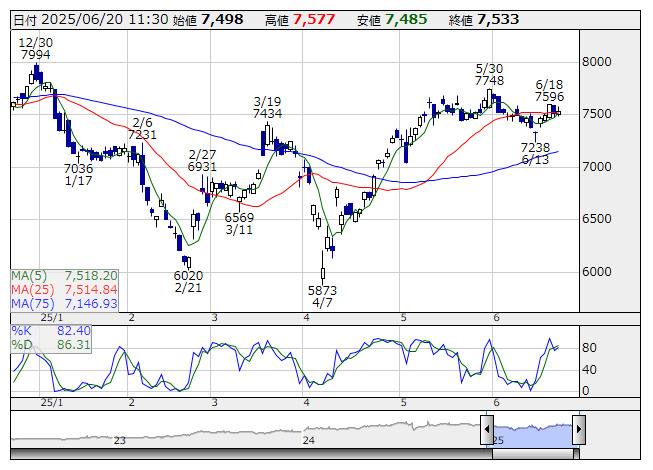 <8001> 伊藤忠商事 7533 +19 ( +0.3%) 7514.8