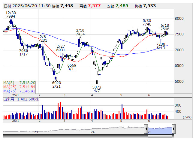 <8001> 伊藤忠商事 7533 +19 ( +0.3%) 7518.2 7514.8
