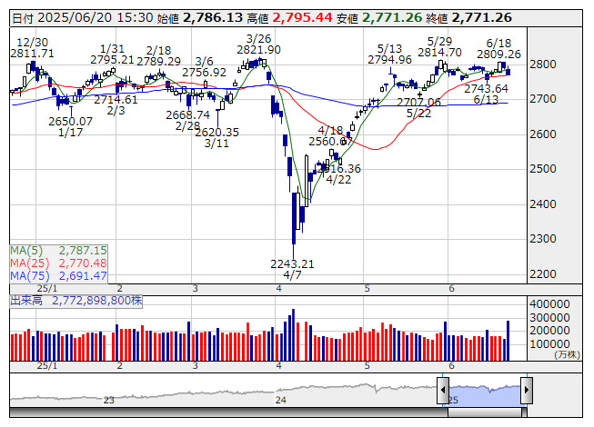 TOPIX <日足> 「株探」多機能チャートより日本取引所が公表した先物手口情報によると、6月20日のTOPIX先物期近(2025年9月限)の日中取引(立会内・J-NETの合算)で、取引高トップはABNクリアリン証券の1万8662枚だった。