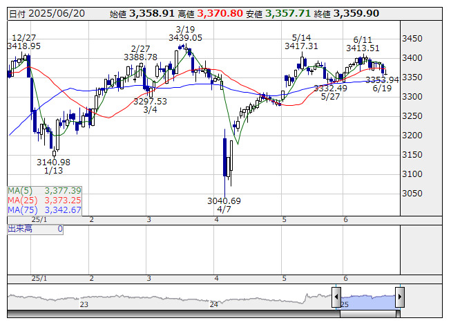 2025年06月23日10時50分 【市況】23日中国・上海総合指数=寄り付き3349.4603(-10.4351) 上海総合 <日足> 「株探」多機能チャートより 23日の中国・上海総合指数は前営業日比10.4351ポイント安の3349.4603で寄り付いた。 出所:MINKABU PRESS