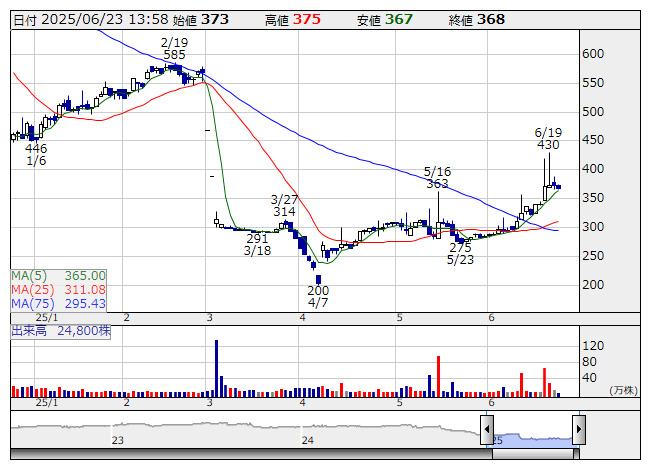 Aクリエイト <日足> 「株探」多機能チャートよりアドバンスクリエイト<8798>は20日、過年度の有価証券報告書及び決算短信等の訂正に関して、2025年5月23日付で東京証券取引所、福岡証券取引所及び札幌証券取引所から有価証券上場規程第504条第1項第1号に基づく「改善報告書」の提出を求められていたが、同年6月20日に提出を行ったと発表した。