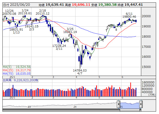 NASDAQ <日足> 「株探」多機能チャートより6月23日の東証グロース市場250指数先物は前営業日比6pt高の746pt。なお、高値は746pt、安値は732pt、日中取引高は2171枚。先週末の米国市場のダウ平均は反発。イランと欧州の会合に加え、トランプ大統領がイスラエル・イラン対立への軍事介入を留まり外交的解決の余地を与えたため安心感から、寄り付き後、上昇。さらに、連邦準備制度理事会(FRB)のウォラー理事が早くて7月の利下げの可能性に言及すると早期利下げ期待を受けた買いも手伝い一段高となった。その後、ウォ―ルストリートジャーナル紙がトランプ政権が半導体を巡る対中規制を一段と強化することを検討していると報じるとナスダックの重しとなり、相場を押し下げ。リッチモンド連銀のバーキン総裁の「利下げを急がず」との発言も上値抑制につながった。さらに、本日はオプション満期日で、テクニカルな取引も見られ、終日調整色が強くまちまちで終了。本日の東証グロース市場250指数先物は、前営業日比1pt高の741ptからスタートした。トランプ大統領がイラン核施設攻撃を発表したことが嫌気され、朝方は下値模索の展開。一方、湾岸戦争やイラク戦争時のダウ平均が堅調に推移していたことから、売り一巡後は買い戻しが加速し、午後にはプラス圏に再び浮上。ダウ平均先物が時間外で上昇したことから、上げ幅を拡大し、高値引けとなる746ptで取引を終了した。東証グロ-ス市場の主力株では、トライアルHD<141A>やサンバイオ<4592>などが上昇した。
