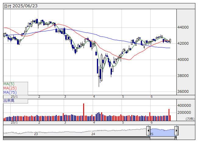 NYダウ <日足> 「株探」多機能チャートより24日の日本株市場は、買い優勢の相場展開が見込まれる。23日の米国市場はNYダウが374ドル高、ナスダックは183ポイント高だった。イランはカタールの米軍基地に報復攻撃を行ったが、事前に通告していたことで報復は限定的と受け止められた。地政学リスクへの過度な警戒感が和らぐなかで原油相場が急落したことが買い戻しに向かわせた。また、米連邦準備理事会(FRB)のボウマン副議長が7月の利下げを支持したことが伝わり、早期利下げ観測が支援材料になった。シカゴ日経225先物は大阪比190円高の38590円。円相場は1ドル=145円90銭台で推移している。