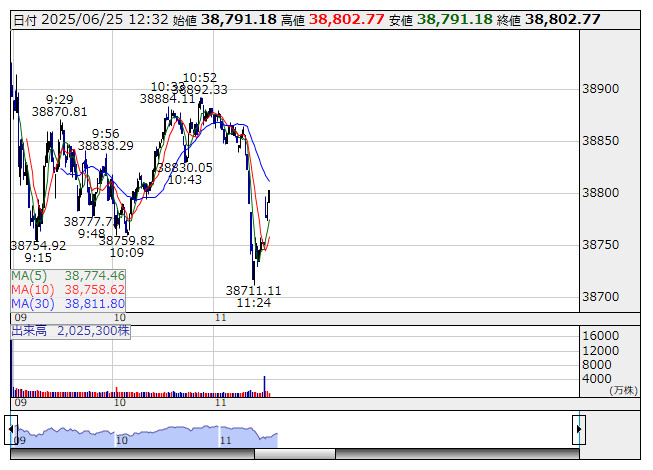 日経平均 <1分足> 「株探」多機能チャートより日経平均 : 38750.47 (-40.09)