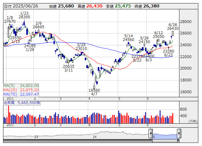 <5803> フジクラ 36364 ( 48) 7,499 +54 ( +0.7%)
