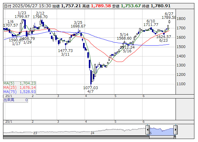 非鉄金属 <日足> 「株探」多機能チャートより●東証33業種 値上がり: 29 業種 値下がり: 4 業種