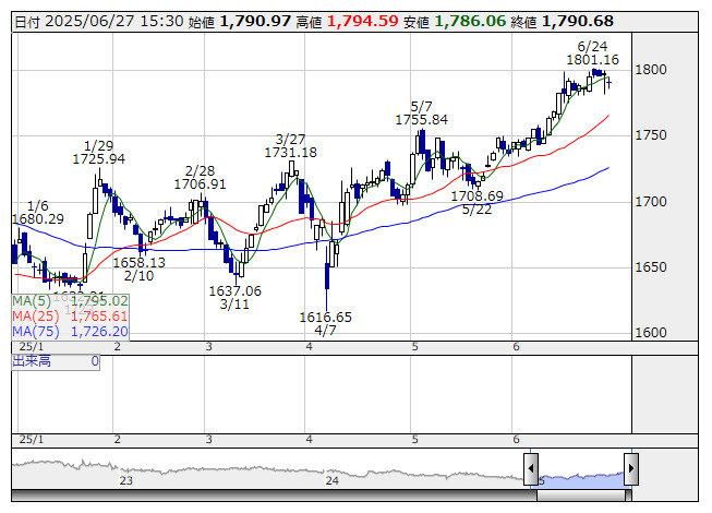 2025年06月27日15時48分 【市況】東証REIT指数先物:27日清算値=4.5ポイント安、1772.5ポイント REIT指数 <日足> 「株探」多機能チャートより 27日15時45分、東証REIT指数先物期近2025年9月限は前日清算値比4.5ポイント安の1772.5ポイントで取引を終えた。出来高は696枚だった。この日の東証REIT指数の現物終値1790.68ポイントに対しては18.18ポイント安。 株探ニュース