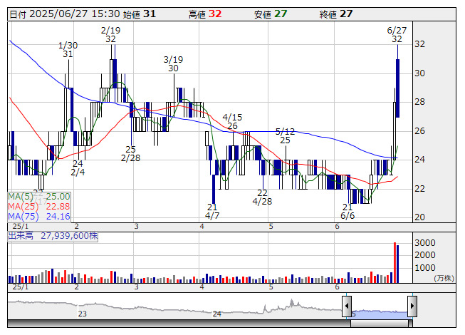 オンコセラピ <日足> 「株探」多機能チャートより■財務省 : 6月27日受付