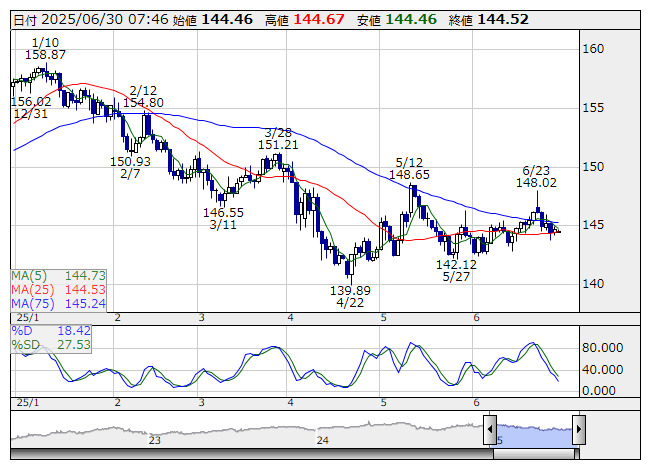 米ドル/円 <日足> Slowストキャス 「株探」多機能チャートより27日のドル・円は、東京市場では144円81銭から144円18銭まで反落。欧米市場では144円26銭から144円95銭まで反発し、144円69銭で取引終了。本日30日のドル・円は主に144円台で推移か。日米の株高を受けて米ドル売り・円買いは抑制される可能性がある。