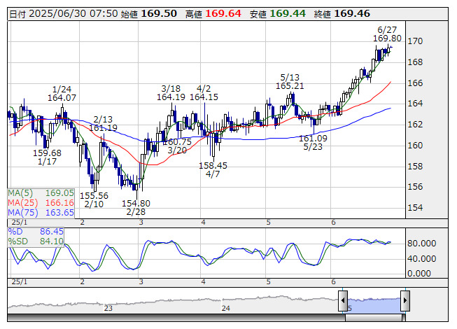 ユーロ/円 <日足> Slowストキャス 「株探」多機能チャートよりユーロ・ドルは、1.0341ドル(2017/01/03)まで下落したが、1.2537ドル(2018/02/18)まで上昇。その後、0.9536(2022/09/28)まで反落したが、2024年にかけて1.1ドル台まで戻している。ユーロ・円は英国民投票で欧州連合(EU)からの離脱が決定し、一時109円57銭(2016/06/24)まで急落。その後137円50銭(2018/2/2)まで買われたあと、長期間伸び悩んだが、日欧金利差の拡大や円安・ドル高の進行を受けて175円16銭(2024/7/10)まで上昇。ただ、その後は上げ渋っている。中東情勢の安定化を受けて欧州中央銀行(ECB)による利下げ終了が強く意識されており、目先的にリスク回避的なユーロ売り・円買いは抑制される可能性が高い。