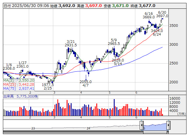 3. <6920> レーザーテク 東証P 3,977 19665 ( +0.6 ) 日経225・JPX日経400採用