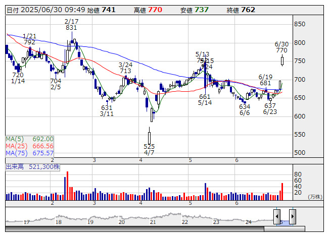 6194>がマド開け大陽線を示現し、一時10%超の上昇で770円まで駆け上がる場面があった。5月14日の急落直前につけた戻り高値769円が上値のポイントとなっていたが、それを上回った。IT・エンジニア向け求人メディア「Green」を運営しており、AIブームが再加速するなか、時流を捉え収益の伸びに反映させている。日米でAI関連株人気に再び火がついており、PER13倍前後で株価が長期波動で底値圏に位置する同社株に対する注目度が高まっているもようだ。配当利回りの高さもAI関連株の中では珍しく、物色人気を後押ししている。